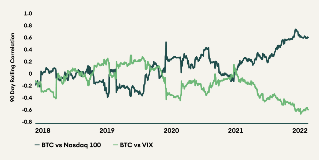 Figure 1: 90-Day Rolling Correlation of Bitcoin with NASDAQ and VIX