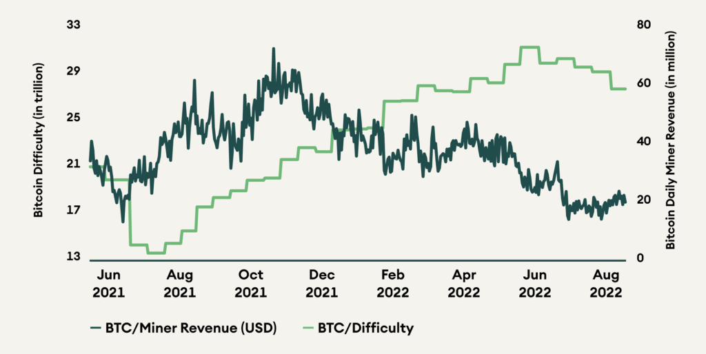 Figure 2: Bitcoin network mining difficulty and daily miner revenue in USD