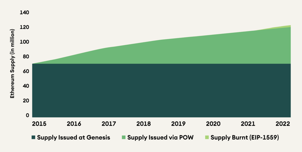 As per this upgrade, users paid the price per unit of gas which is at least as high as the current protocol-determined base fee, which is burned, in addition to the priority fee, which is paid to miners for timely inclusion of transactions in a block. This limits Ethereum as only an inflationary asset as now it is subject to deflationary bursts in proportion to excess fees burnt. Since the implementation of EIP-1559, more than 2.5 million ETH have been burnt. The following chart shows the issuance of Ethereum supply over time, along with recent changes.