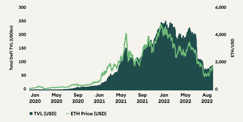 The increase in prices of DeFi tokens and Ethereum, the most extensive DApps ecosystem, can be seen in the total value locked (TVL) chart below. The TVL that consists of all decentralised applications across multiple blockchains was more than USD 250 billion in November 2021, and it had fallen to a low of USD 69 billion in June 2022. It has since recovered and is now closing in at USD 90 billion.