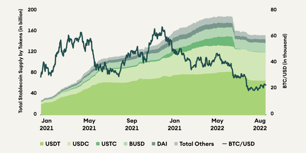 Stablecoins gained immense popularity in the last two years as DeFi summer began in 2020. Stablecoins are essential for adoption of DeFi and provide a base for swap or interaction between different coins. 2020 saw an influx of experimentation in the form of algorithemic stablecoins but that experiment failed to a wider market contagion. Investor confidence was shaken and trust in centralised audited stablecoins was reinforced. As a result, the leading stablecoin USDT circulating supply has been reduced by almost 20%, and USDC has gained 10%. The total supply of stablecoins in the market continued to increase, although bitcoin and other crypto asset prices have decreased since November 2021. It is only after the fall of Terra Luna; that the overall supply has been reduced.