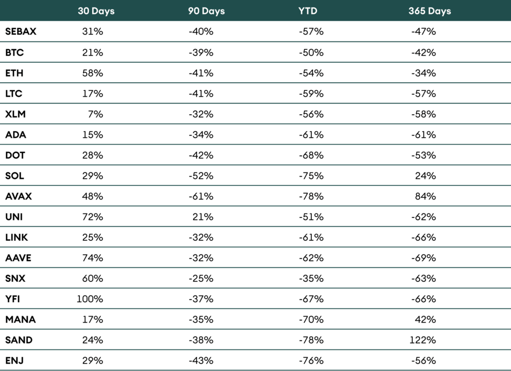 The AMINAX® Index, a selection of blue-chip cryptocurrencies, has also recovered in the last month by 31%. During the same time, alternative smart contract platforms such as Avalanche (AVAX), Solana (SOL), and Polkadot (DOT) have recovered more than Bitcoin but less than DeFi tokens, Uniswap (UNI), Aave (AAVE), Synthetix (SNX), and Yearn Finance (YFI). It is essential to note the year-to-date (YTD) performance of all assets in the AMINA coin universe are still negative, with Synthetix losing the least by 35% and Avalanche losing the highest at 78%.
