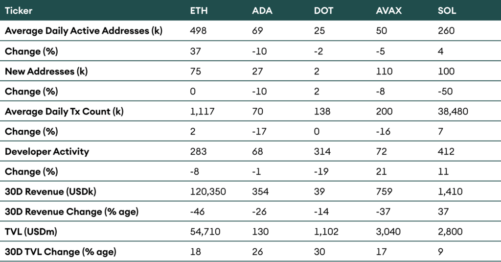- On-chain activity for alternative platform blockchains is growing with Avalanche having the highest number of new addresses, Solana with the highest numbers of daily transaction count, and one of the Polkadot parachains, Acala doubled its TVL with the help of native stablecoin called AUSD