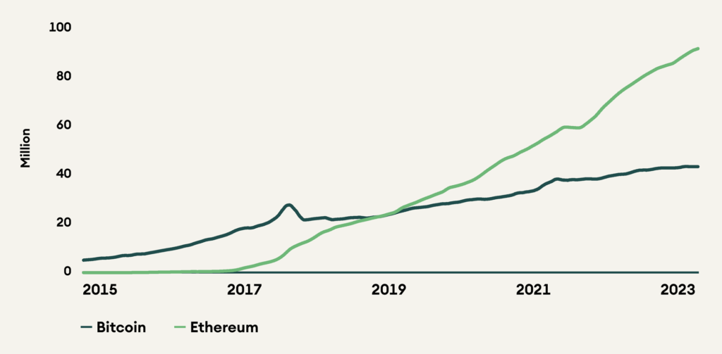 As of writing, Ethereum is on track to reach another milestone of having 100 million addresses with a non-zero balance, currently standing at approximately 92 million. In comparison, Bitcoin has over 43 million total addresses on its network.