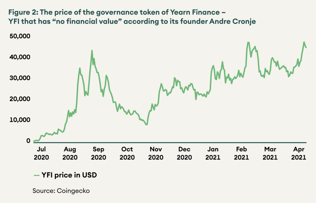 Instead of raising funds through an ICO, governance tokens are usually distributed to users and contributors of the protocol to incentivise protocol adoption and decentralise the governance among the most interested participants. During the fair launch of YFI tokens, Andre Cronje, the founder of Yearn Finance, famously called it to have “no financial value” as no payment had to be made to acquire YFI. However, control over the direction of a multibillion-dollar protocol and its treasury is desirable, and therefore the tokens are valuable.