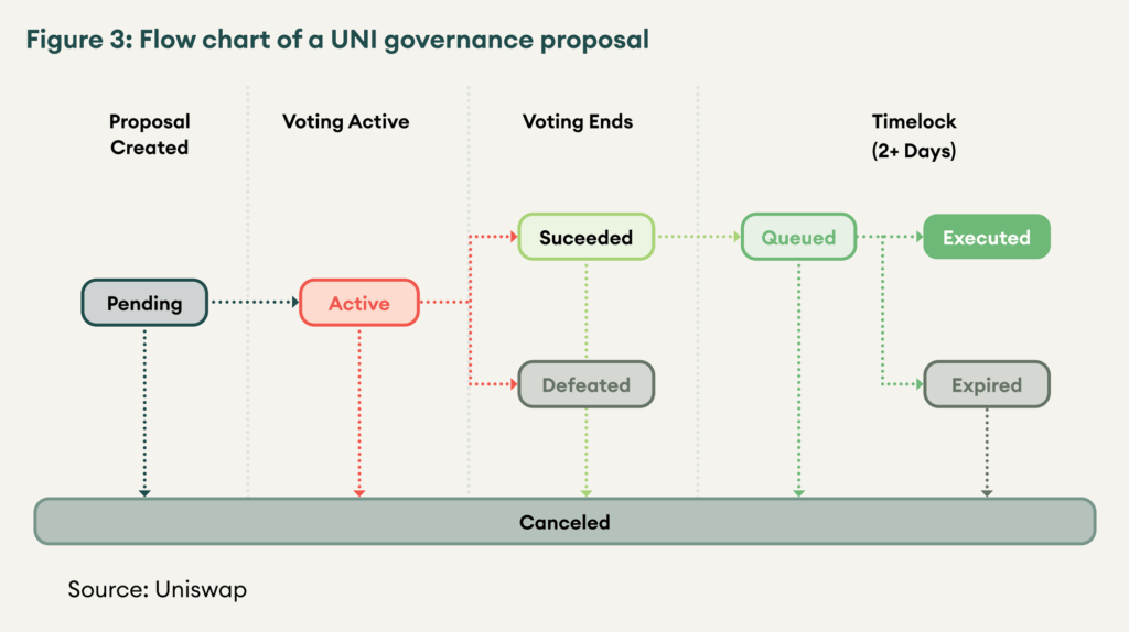 The DAO defines a process that must be followed for changes to proposed and implemented. We will use the example of Uniswap governance. All token holders get one vote for each UNI token held. This has a dual purpose – large token holders are more invested in the success of the protocol and therefore should have a higher say, and attacking the governance process through acquisition of majority tokens becomes expensive. To propose a change, the individual typically posts it first on the discussion forum to get feedback and gauge whether there is enough interest. Then they must collect the support of holders of 10 mn UNI or 1% of total supply to propose a vote officially. Once the vote is proposed along with the new code, it will pass if it has both a majority and at least holders of 4 mn UNI tokens voting in favour. If it passes, there is a minimum of two-day time lock to ensure the code is safe to deploy, after which it is deployed to the contract. Some DAOs have a non-binding signalling vote before the actual vote to gauge whether there is interest in a proposed change and towards which direction it is leaning.