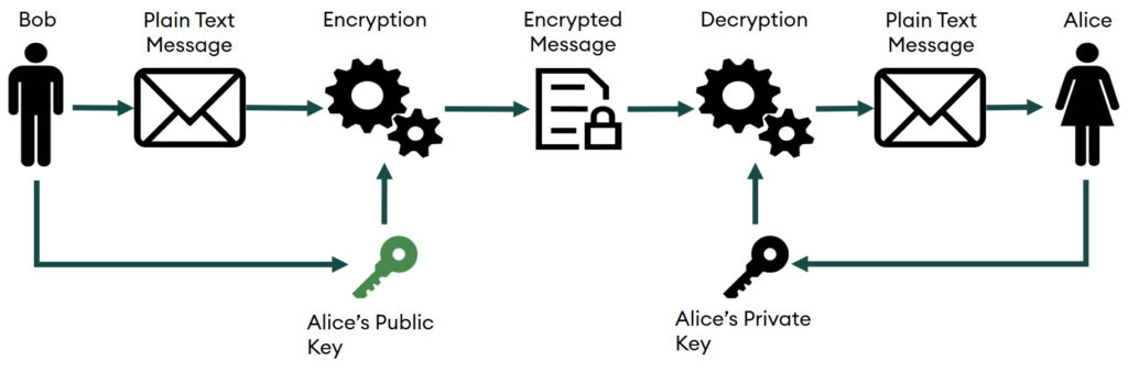 Let us consider a scenario where Alice and Bob privately send messages to each other. To do this securely, using an asymmetric cryptography method, they will generate two pairs of private and public keys, of which one pair will be with Alice and the other will be with Bob. The public key is available for all to view, so both Alice and Bob can look at each other’s public keys. However, the private key is kept as a secret by its owner. As shown in figure 1, to send a message to Alice, Bob will encrypt the message by using Alice’s public key and then send it to Alice. On receiving the message, Alice can use her private key to decrypt Bob’s message.