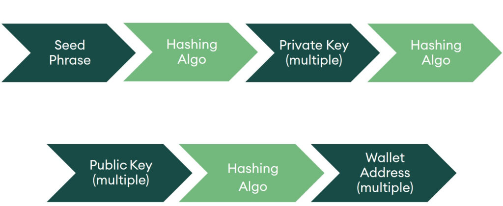 On the other hand, the private key is used to digitally sign4 new transactions and provide access to the funds in the wallet; therefore, it should not be shared with anyone. In very simple terms, it is equivalent to your password or a PIN. For easier private key management, most modern wallets generate a seed phrase out of which the private keys can be recovered. Seed phrases are a list of words that store all the information needed to get access to the wallet. The process of using the seed phrase to recover funds is shown in figure 2. One can only move from the seed phrase towards the wallet addresses and not the other way round, due to the hash function’s one-way nature. If the seed phrase is lost, the funds are almost impossible to recover. It is best practice to store both your seed phrase and private keys offline in a safe location, as anybody who has the seed phrase or private keys can access and control the wallet.