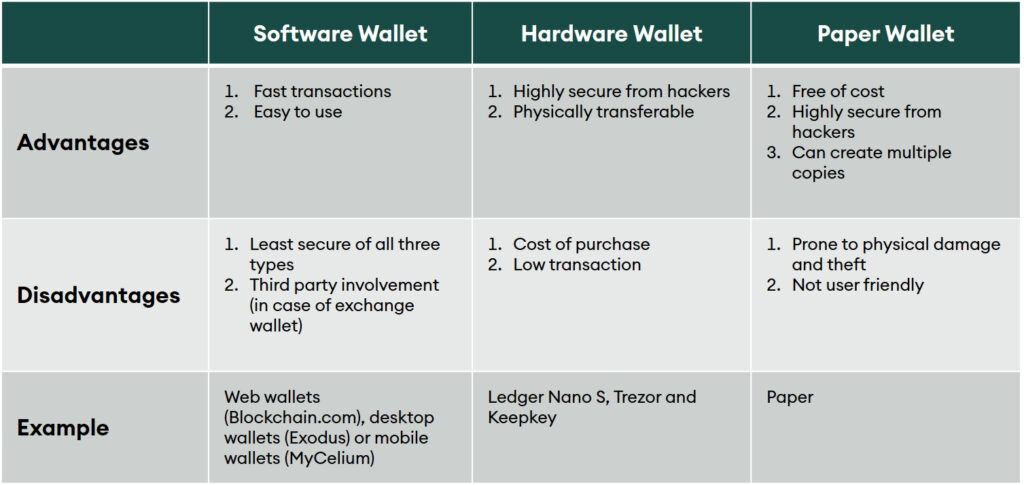 There are many ways to classify a wallet. The two most common ways are based on the physical status and the operational structure of the wallet. Depending on their physical status, the majority of crypto-asset wallets can be classified as software, hardware, or paper wallets. Each type offers some advantages and disadvantages over the others (figure 3).