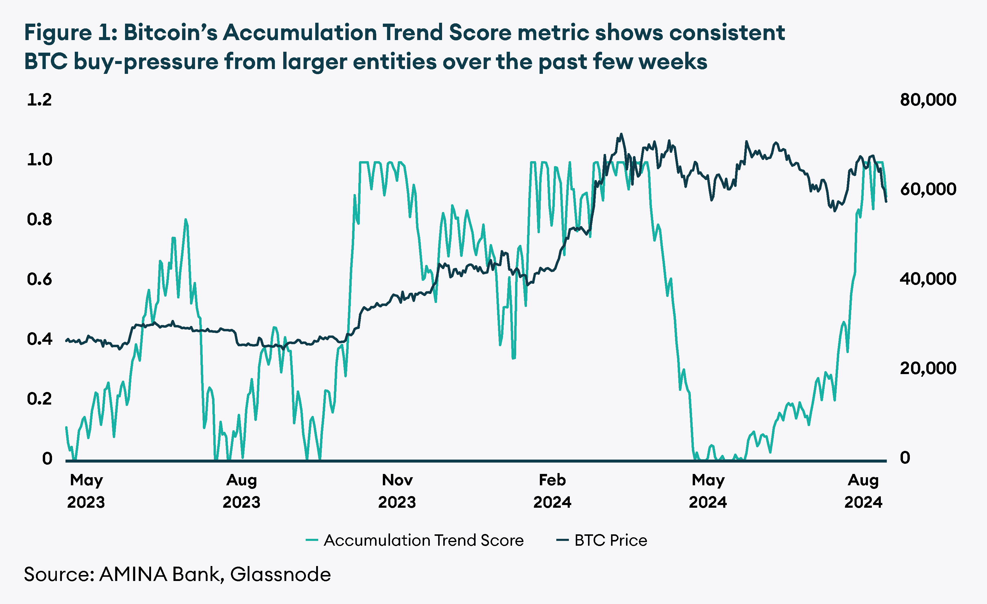 Figure 1: Bitcoin’s Accumulation Trend Score metric shows consistent BTC buy-pressure from larger entities over the past few weeks