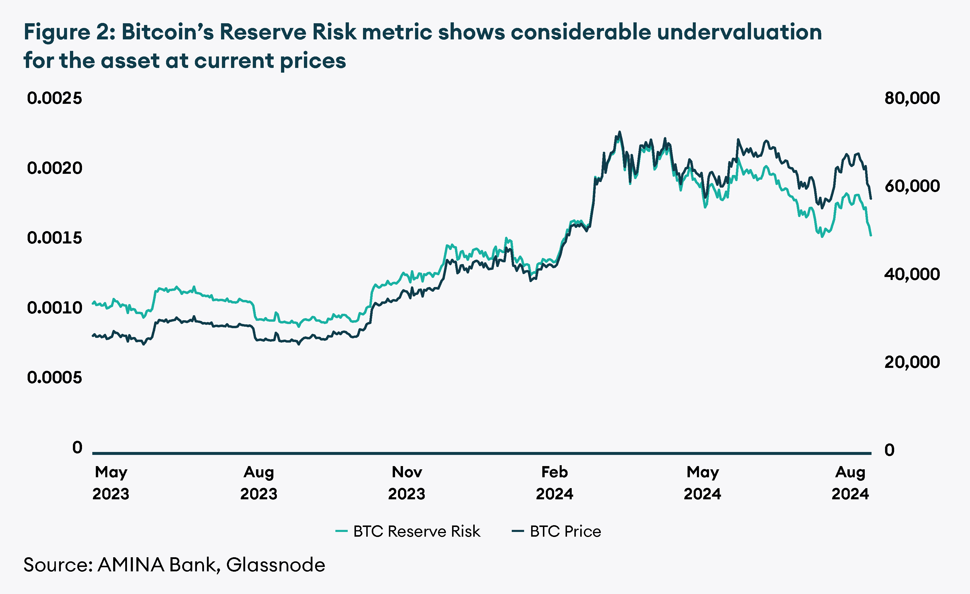 Figure 2: Bitcoin’s Reserve Risk metric shows considerable undervaluation for the asset at current prices