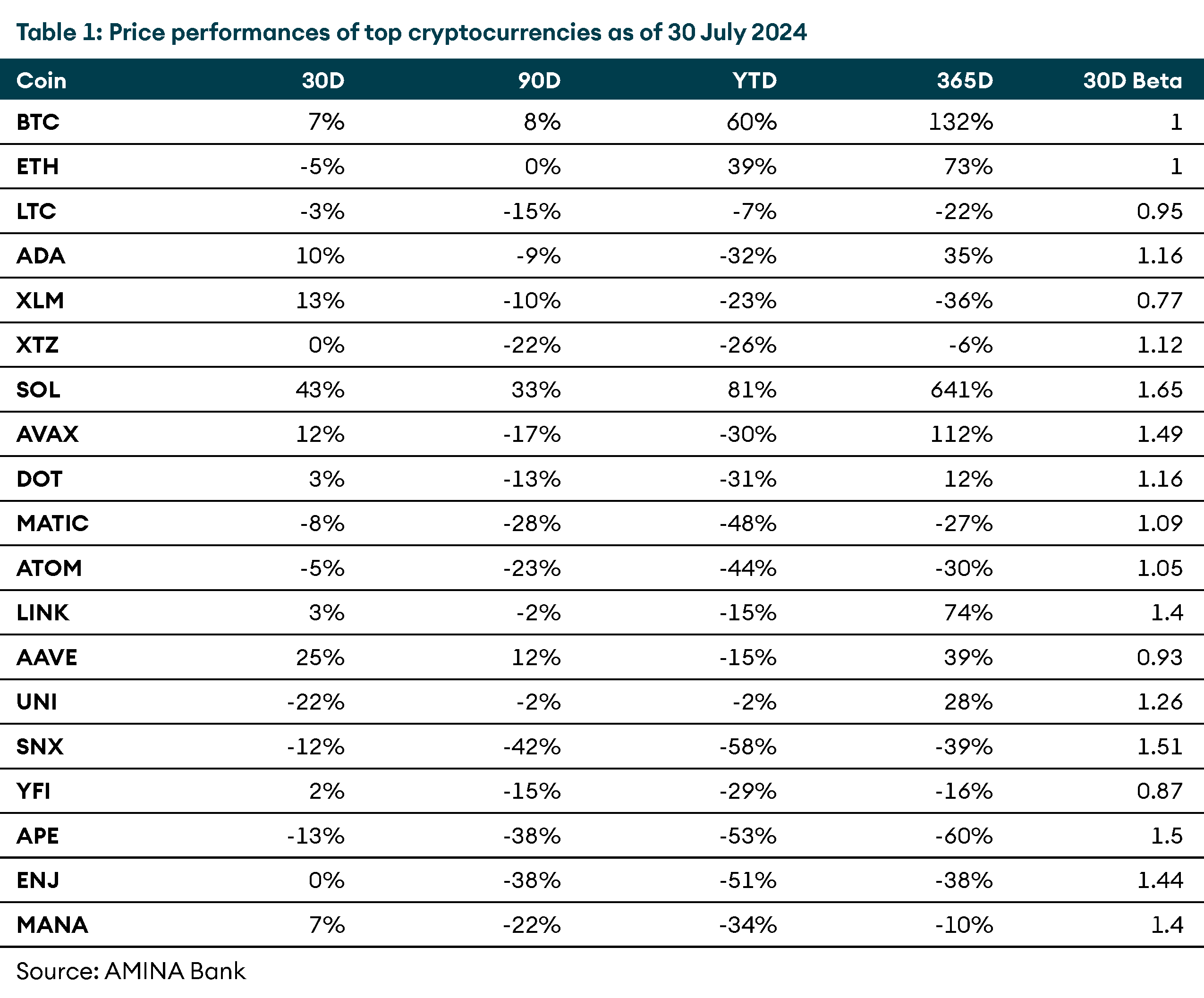 Table 1: Price performances of top cryptocurrencies as of 30 July 2024