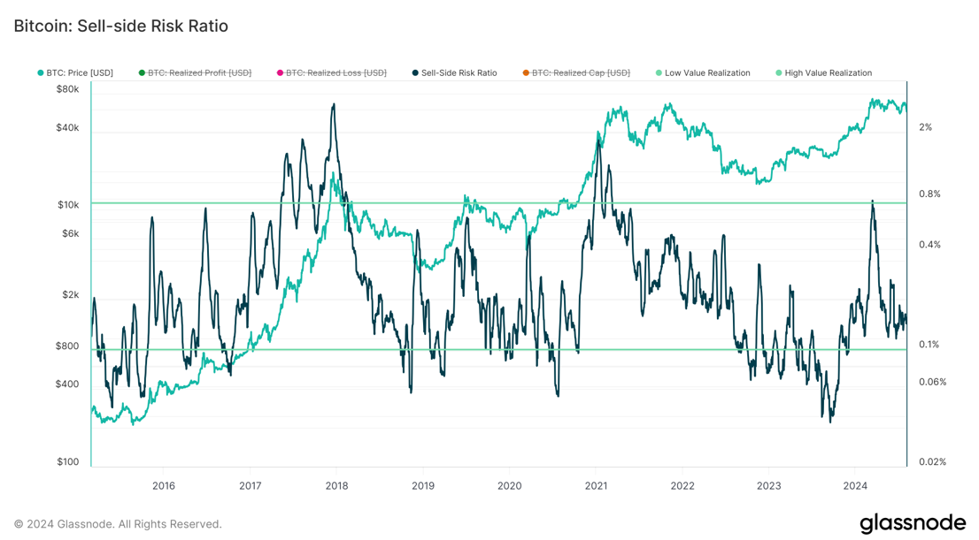 Figure 3: The Sell-Side Risk Ratio metric indicates that at current levels, it is safe to enter an investment in BTC