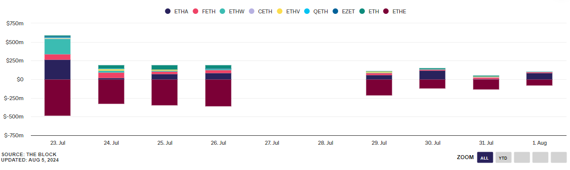 The first few weeks of trading for Ethereum ETFs largely met market expectations. The nine ETFs generated $6.62 billion in total volume and total AUM stands at $8.46 billion at the time of writing. Outflows from Grayscale’s ETHE ETF is down over 80% from initial levels and continue to go down. Meanwhile, BlackRock’s ETHA leads the US spot ETH ETF market with inflows much higher than the rest of the pack.