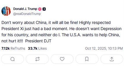 The trigger seemed to be President Trump’s announcement of 100% tariffs on Chinese imports, effective November 1. Posted on Truth Social during active trading hours, the news sent traditional markets down $1.2 trillion in 40 minutes. Crypto markets, operating with higher leverage and volatility, reacted more sharply.