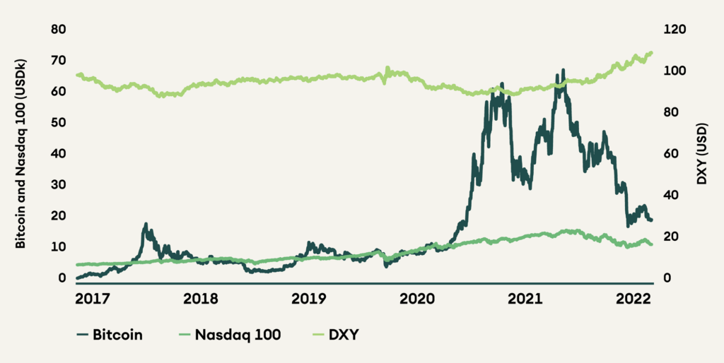 Figure 1: Price performance of Bitcoin, Nasdaq 100 and DXY