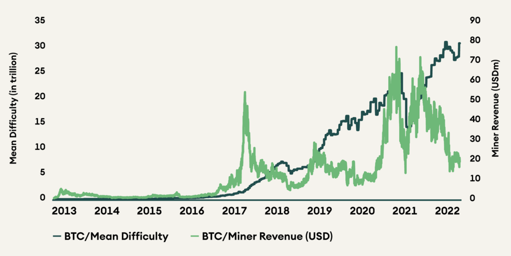 Figure 2: Bitcoin network mining difficulty and daily miner revenue in USD