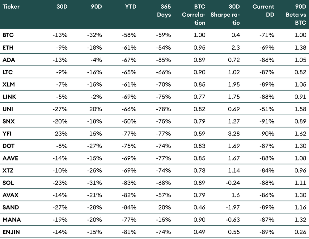 The correlation between BTC and the Nasdaq 100 (a tech-heavy index) retracted to yearly low levels of 0.5-0.6. Most major cryptocurrencies by market cap followed BTC. Market outperformers for the month include Yearn Finance, up by 23%.