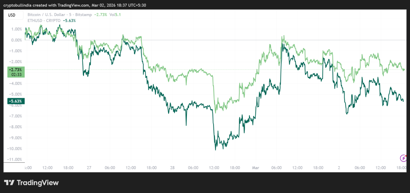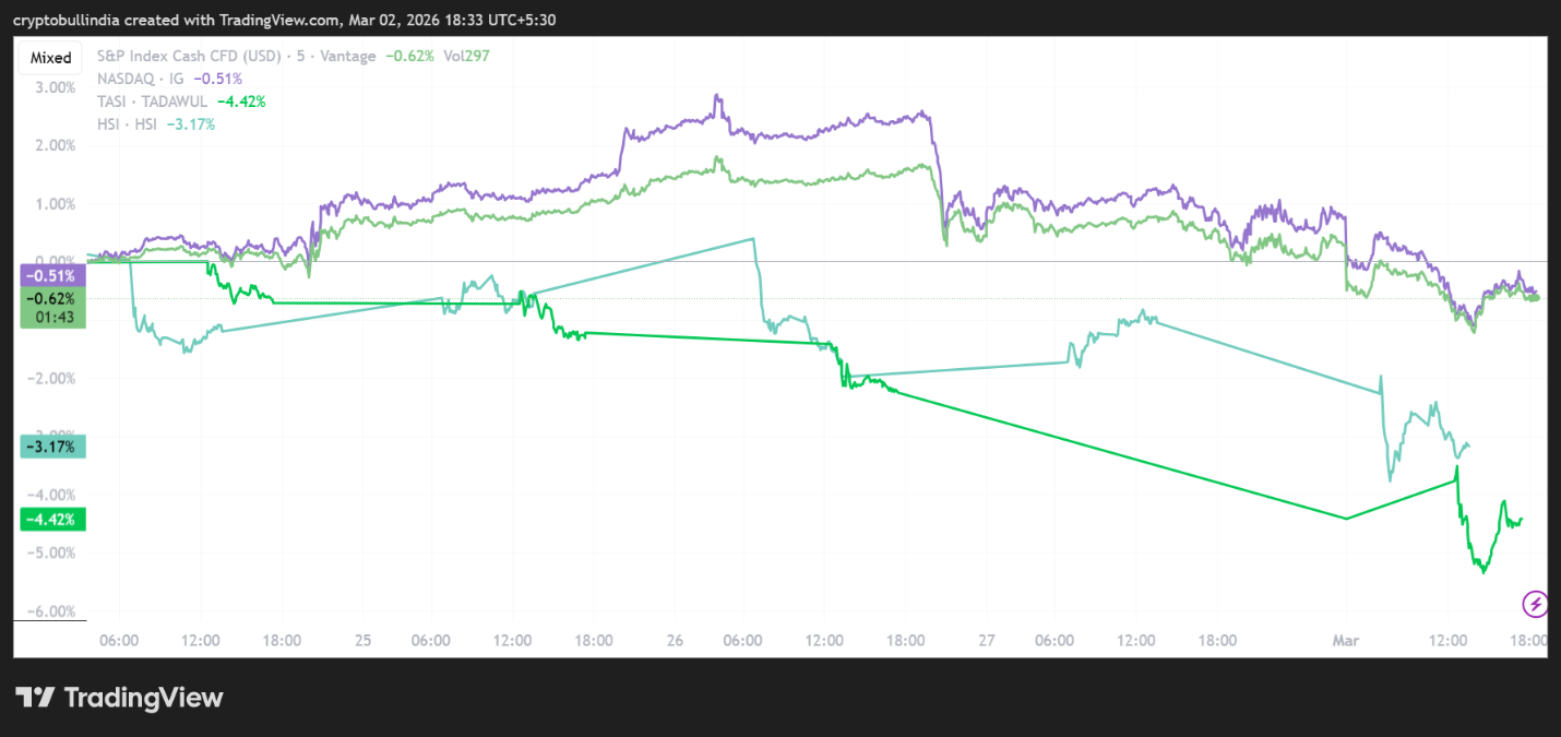 Crypto markets, which trade continuously, reflected early investor sentiment. Bitcoin declined before partially stabilising. Ether and broader crypto market capitalisation also moved lower.