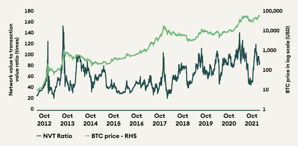 Figure 1: Bitcoin’s NVT ratio has not yet spiked to previous levels of frothiness