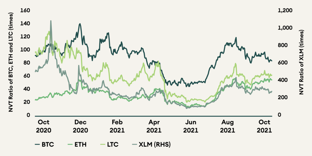 The payment coins, litecoin and lumen, participated in the rally but at a slower pace, closing up by 26% and 34% in October. However, unlike bitcoin, their NVT ratio deteriorated during the price rise, indicating that the network usage did not increase in line with the prices. Litecoin’s NVT ratio increased by 21% to 63, and lumen’s increased by 5% to 291. Ether’s NVT ratio also saw a sharp increase of 25% to 55, although it is still the lowest of the four.