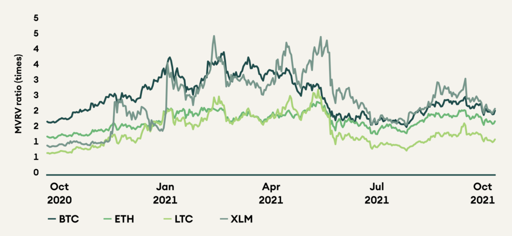 Figure 4: MVRV ratios of the coins increased for the month but are still significantly below their 1-year highs