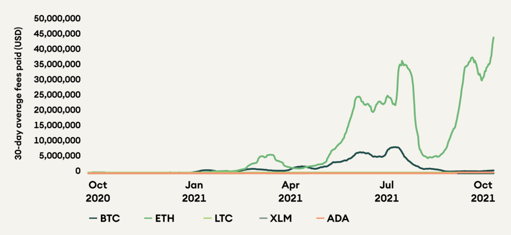Figure 5: Fees paid on Ethereum dwarves the fees on any other blockchain