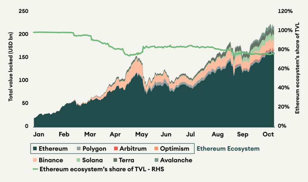 Figure 6: Ethereum ecosystem’s share of TVL has fallen from 99% at the beginning of the year to 77%