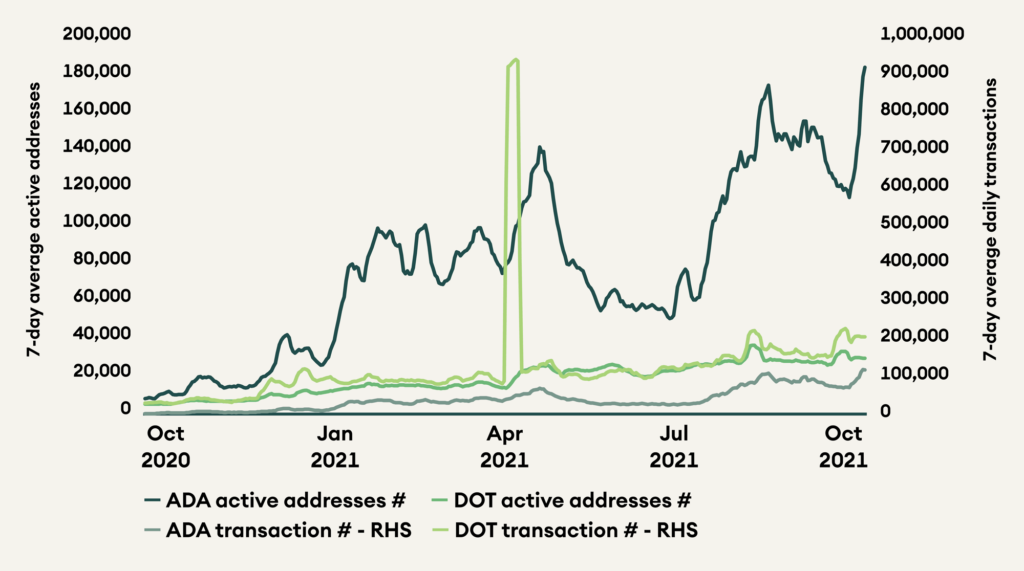 Ethereum is the most used chain by a large margin, but its market share is eroding. Some users prefer competitive chains with lower transaction costs. Alternative platform chains’ performance was mixed in October. While Cardano performed poorly, Polkadot did very well. In November, Polkadot parachain auctions will begin and for Cardano, the ecosystem is being built.