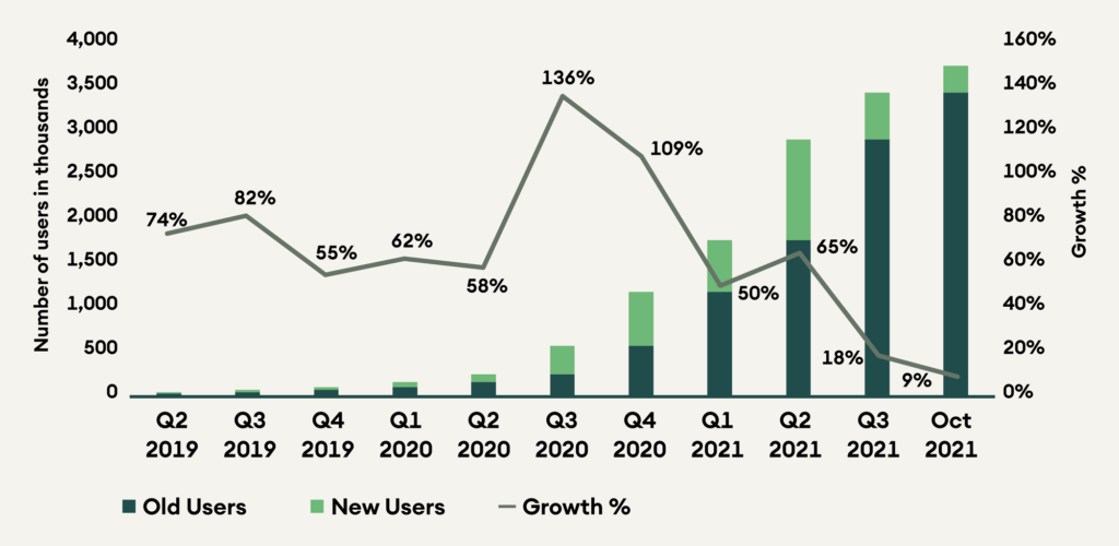 Decentralised finance (DeFi) has underperformed this year. High gas prices, change in the dominant narrative, and a regulatory overhang has depressed activity and compressed valuations. Ethereum DeFi apps added 535,000 users in Q3 2021, less than half of Q2 2021 at 1.1 million. Q4 has seen a slight uptick as the trending dog coins are primarily traded on decentralised exchanges like Uniswap.