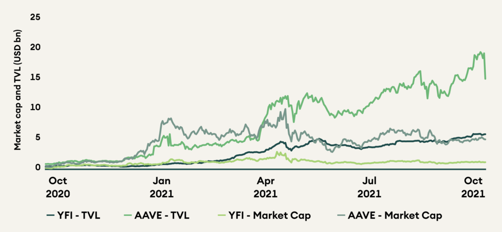 Figure 9: Market cap for Aave and Yearn Finance has not kept pace with TVL growth