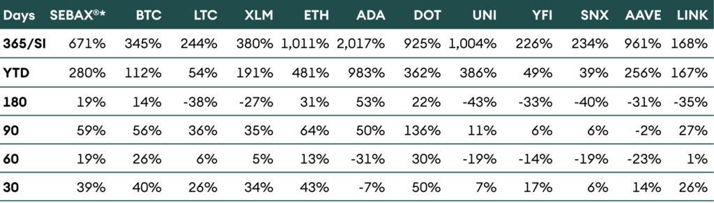 Table 1 summarises the performance of a selection of currencies. It shows Bitcoin primarily led the rally, as it moved up by 40% last month. Ether and Polkadot did even better as their price increased by 43% and 50%, respectively. It is worth noting that Cardano’s price (ADA) shrunk by 7%, and the DeFi sector (UNI, SNX, AAVE, YFI) continues to underperform.