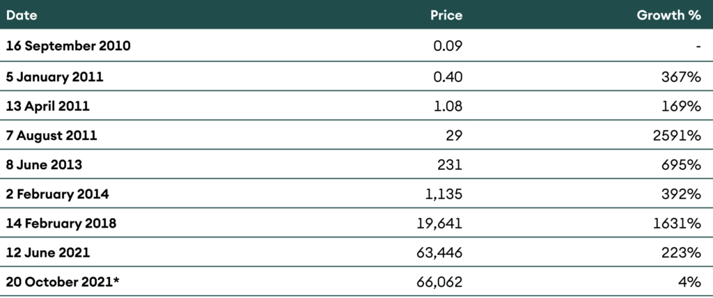 Table 2: Historically, the price of bitcoin increased by an average of 867% between successive cycle tops