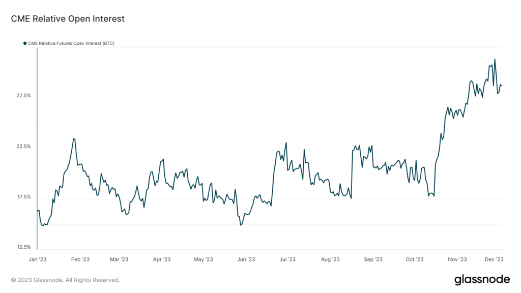 The SEC’s non-appeal of a court order to review Grayscale’s Bitcoin ETF application signals a potential shift in stance, fuelling optimism for Spot BTC ETF approvals. This optimism reflects in the Bitcoin futures market, where CME’s open interest in Bitcoin futures reached a record 29.2% (see figure 3), indicating growing institutional involvement and integration of digital assets in large financial portfolios.