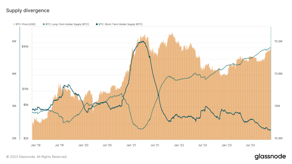 Figure 4: Divergence in long term vs short term BTC holders’ behavior