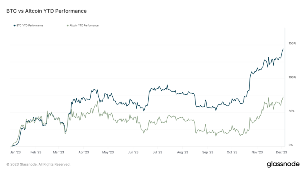 To further illustrate this trend, comparing the year-to-date (YTD) increases in market capitalization between Bitcoin and the aggregate altcoin market (excluding stablecoins) is insightful. Bitcoin’s market cap surged by 140% in 2023, while altcoins’ market capitalization only increased half of it, by 69% (see chart below).