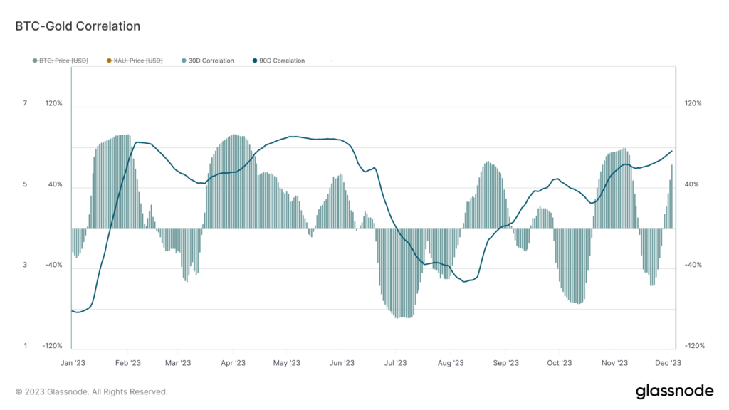 Data supports this narrative, especially in the context of recent geopolitical and macroeconomic uncertainties. Bitcoin’s evolving relationship with traditional assets is evident in its correlation patterns. As of November, Bitcoin’s 30-day correlation with gold averaged 72%, indicating similar price movements. However, the 90-day trend remained consistent (see figure 6).