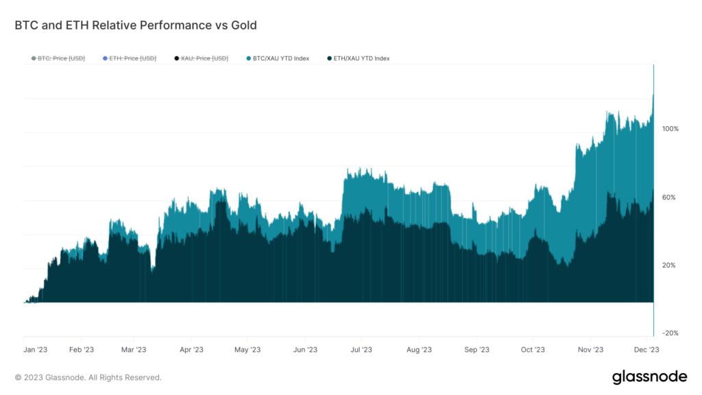 The comparison of Bitcoin (BTC) and Ethereum (ETH) prices in terms of gold offers a unique perspective on their performance relative to a traditional store of value. In 2023, BTC has appreciated significantly, up by 110% against gold, while ETH has also shown notable growth, rising 60% in gold terms (see figure 7). The robust performance of both cryptocurrencies, during a time of increasing global uncertainty, is likely attracting attention from traditional investors.