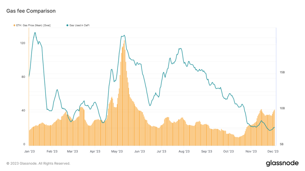In an extended analysis of Ethereum’s gas fees, particularly in relation to decentralized finance (DeFi) activities, an interesting trend emerges. Historically, before the widespread availability of Layer 2 solutions, there was a direct correlation between gas fees and the amount of gas used in DeFi transactions on Ethereum. As gas usage in DeFi increased, so did the gas fees, moving almost in tandem.