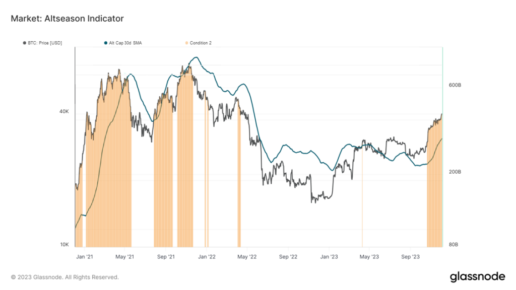 In figure 9, we look for periods where the aggregate valuation of the Altcoin sector is greater than its 30D simple moving average (SMA). Since 20th October this indicator is flashing positive, preceding the BTC jump from USD 29,500 to the current price of USD 41,000.