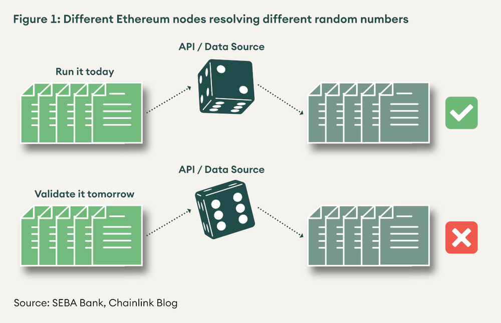 For blockchains used only to settle value like Bitcoin, Litecoin, Ripple, this limitation is not an issue. For blockchains designed to run smart contracts and applications like Cardano, Ethereum, Polkadot, to name three, this is a severe limitation. The ability to interact with the outside world and to use information is key to unleashing the full power of decentralised applications. Without it, any decentralised applications (dapps) built on these platforms will be limited to only information available on the blockchain. For example, consider the case of a prediction market for whether the price for ETH will exceed, say, USDk 5 at any point in 2021 or not. No information on the Ethereum blockchain records ETH price in USD so the prediction market would not be able to resolve whether the condition has been met or not. Similarly, since smart contracts are executed separately and independently at every node, for an application that leverages random numbers, every node may resolve a different random number and achieve a different result (see figure 1). Multiple results would stop the block from achieving finality as consensus would not be achieved. Further, it breaks down the deterministic quality of blockchains – the ability to rerun all the transactions and get to the same result.