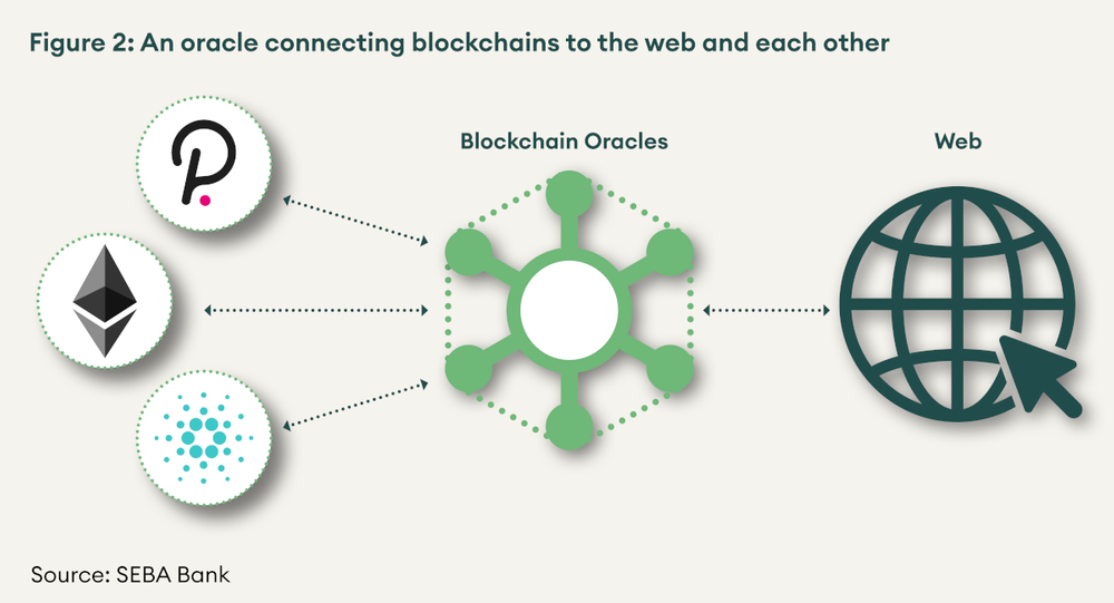 - On-chain oracles act as bridges between blockchains, allowing blockchain information to be read and used by other blockchains. For example, a multi-chain decentralised exchange (DEX) aggregator will need price feeds from the decentralised exchanges running on Ethereum, Cardano and other blockchains to fetch the best price available. For this purpose, an on-chain oracle may run through the DEXes on Ethereum, Cardano and others to fetch the best price for the aggregator. An on-chain oracle may also be one dapp providing oracle services to another dapp. For example, Uniswap (a decentralised protocol for automated market making) natively knows the price between any two assets listed on the platform through its liquidity pool. Any dapps that need the price relationship between the two assets can use this data.