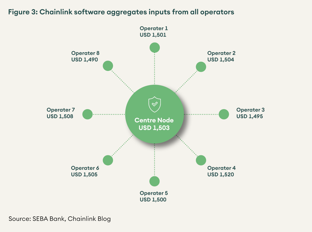 Chainlink is the leading decentralised oracle solution with almost all large DeFi projects relying on its data feeds. It is an off-chain oracle with a network of independent node operators that gathers and delivers data to its middleware application. The middleware application aggregates and combines it into single data output and delivers it to the blockchain to be read by smart contracts relying on it.