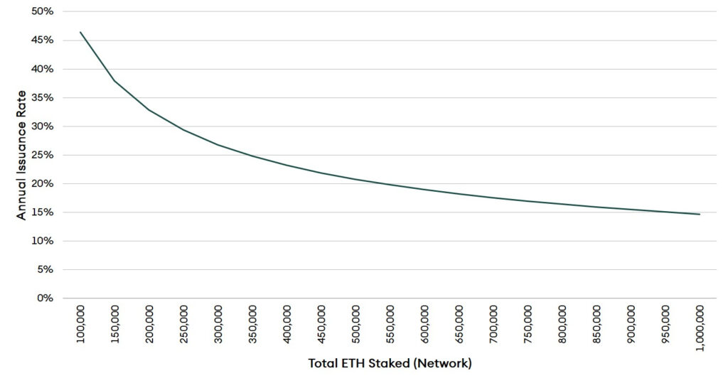 During Phase 0, two Ethereum chains will exist simultaneously, one PoW and another as PoS, which will run independently. Both networks will have their own supplies and inflation rates; therefore, with the introduction of Ethereum 2.0 the overall inflation rate of Ethereum (i.e. Ethereum 1.0 and 2.0 combined) will increase until both chains merge (i.e., Phase 1.5). Ethereum 2.0’s rate of issuance will directly depend on the number of ETH2 staked in the network at any time. The relationship between the supply and number of ETH staked in Ethereum 2.0 is defined as follows: