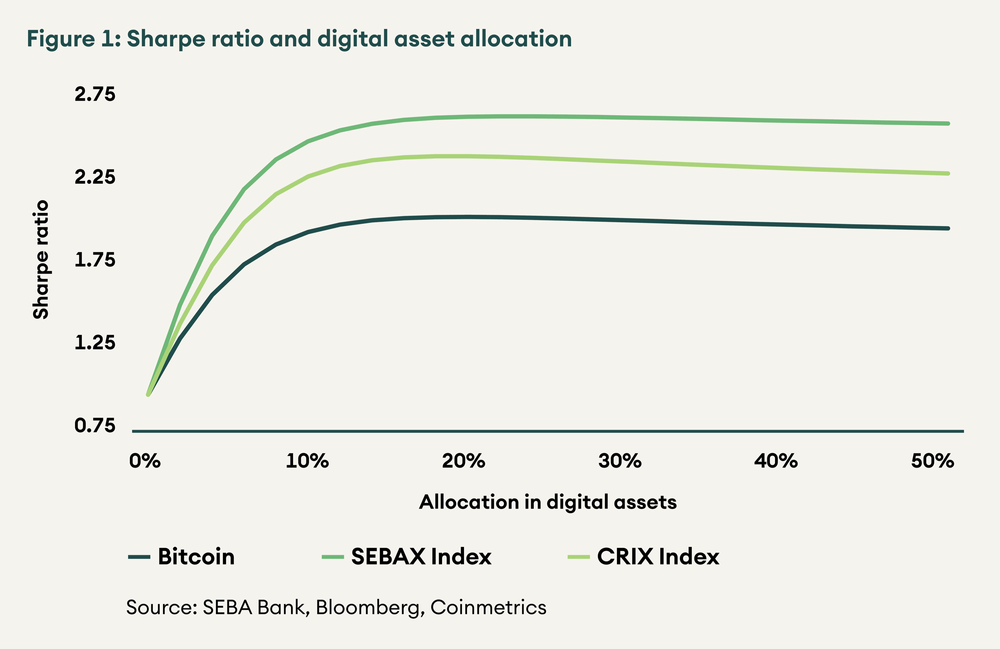 The benefit of digital asset diversification is important even for small allocation. For example, for a portfolio having a 4% allocation to digital assets, the Sharpe ratio increases between 50% and 90% according to the cryptocurrency index used. The portfolio achieves the highest Sharpe ratio when allocation is around 20%. The conclusion remains unchanged regardless of other assumptions (high correlation between cryptocurrencies and traditional assets).