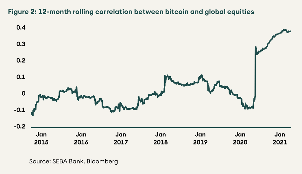 This episode is now over, but the correlation has remained elevated since. The 12-month correlation between equities and bitcoin that was historically hovering around zero is now just below 0.40 (figure 2). As we have seen, a positive correlation harms the Sharpe ratio as it reduces the diversification potential.