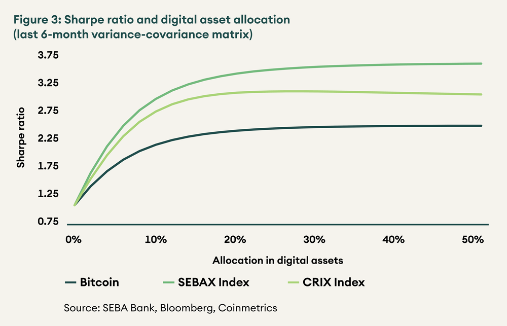 The addition of digital assets significantly improves the Sharpe ratio as all the three lines show. Adding bitcoin only, potentially doubles the Sharpe ratio. Interestingly, investing in a basket of digital assets instead of bitcoin-only provides an additional significant improvement in the portfolio Sharpe ratio. It means there is a considerable diversification potential within digital assets.
