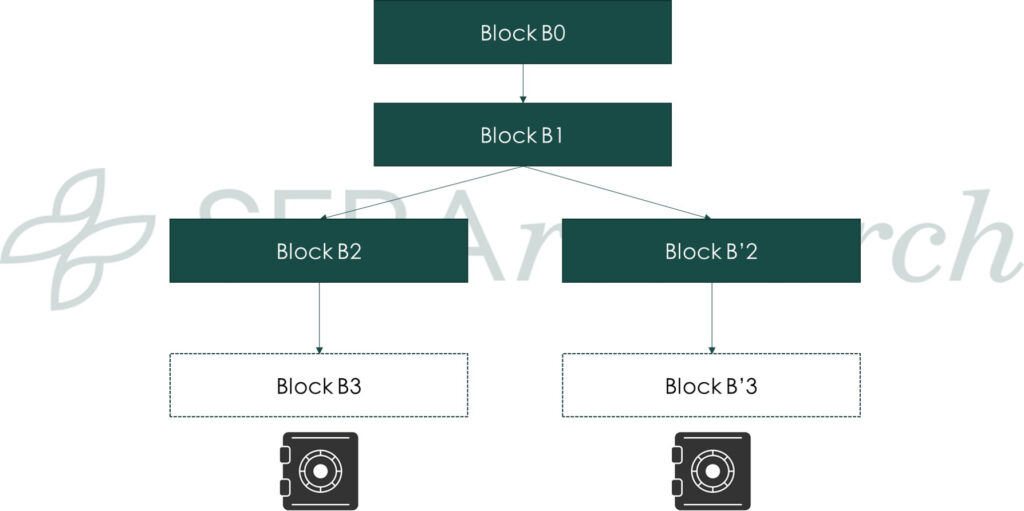 However, in a PoS-based ecosystem, there is no significant external cost associated with staking for the validators. Also, as both Block B2 and Block B’2 have the same previous block (Block B1), the account balances for all the validators are the same. Hence, the probability that a validator will mine the next block on both chains remains the same. This is because their staked coin balances are duplicated on both chains. This incentivises the validators to stake their tokens on both chains to optimise their profitability. This can also lead to many network problems like double-spending (Exhibit 3).