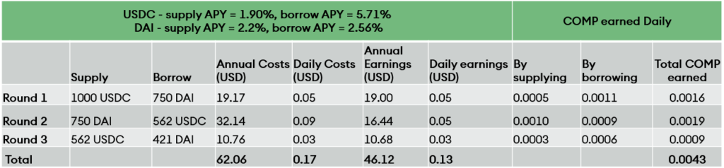 Table 1 – Illustration earnings by supplying and borrowing assets using the Compound protocol