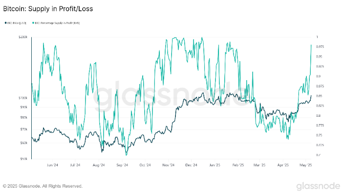 Onchain data confirms growing investor confidence. According to data from Glassnode, approximately 97.5% of the current bitcoin circulating supply is in profit. This marks a significant improvement over previous months and leads to an improvement in sentiment for Bitcoin holders.